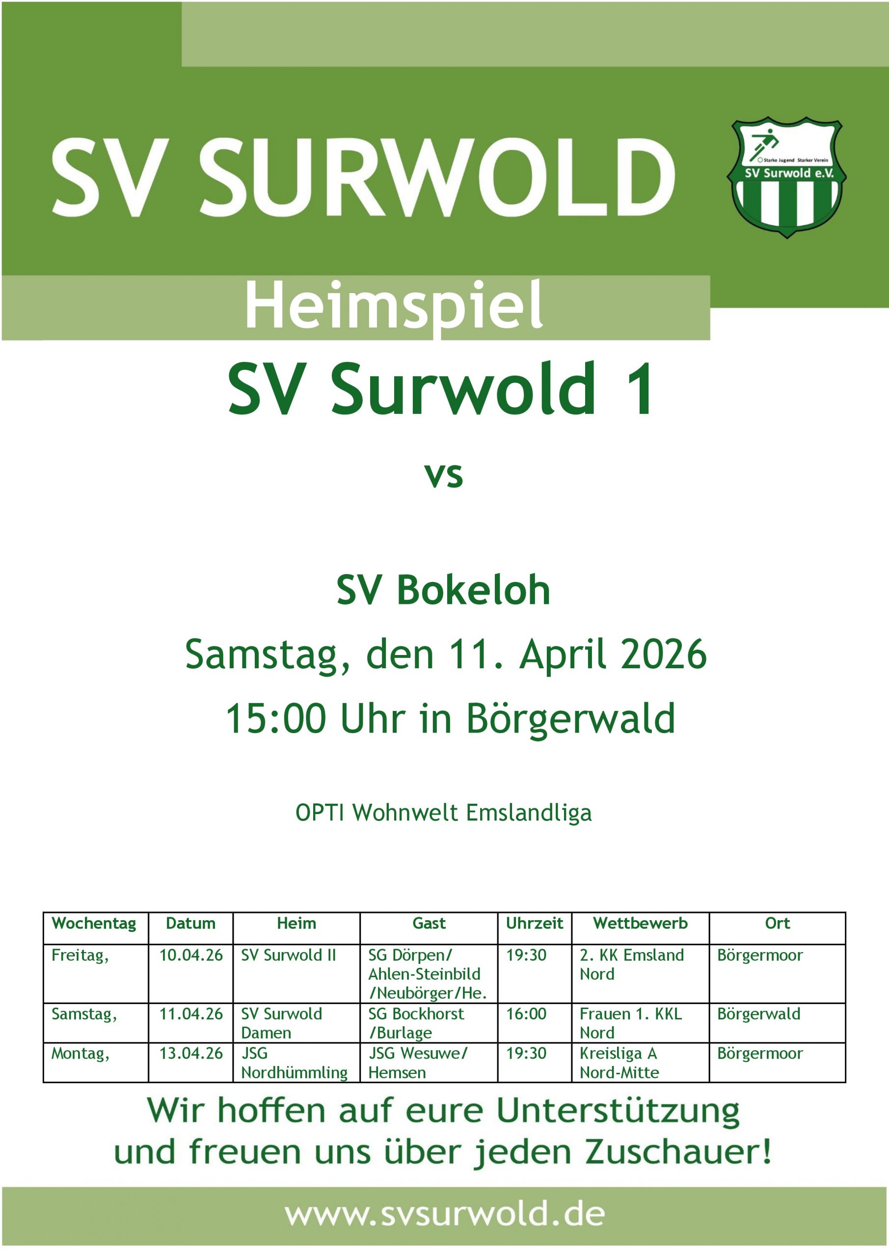Fußball Vorschau: Heimspielwochenende für alle Teams – die 1. Herren empfängt den Tabellenführer aus Bokeloh am Samstag in Börgerwald. Die 2. Herren spielt bereits am Freitag in Börgermoor und die Damen spielen Samstag im Derby gegen Bockhorst/Burlage. Die A-Jugend der JSG trägt die Heimspiele nun in Börgermoor aus.